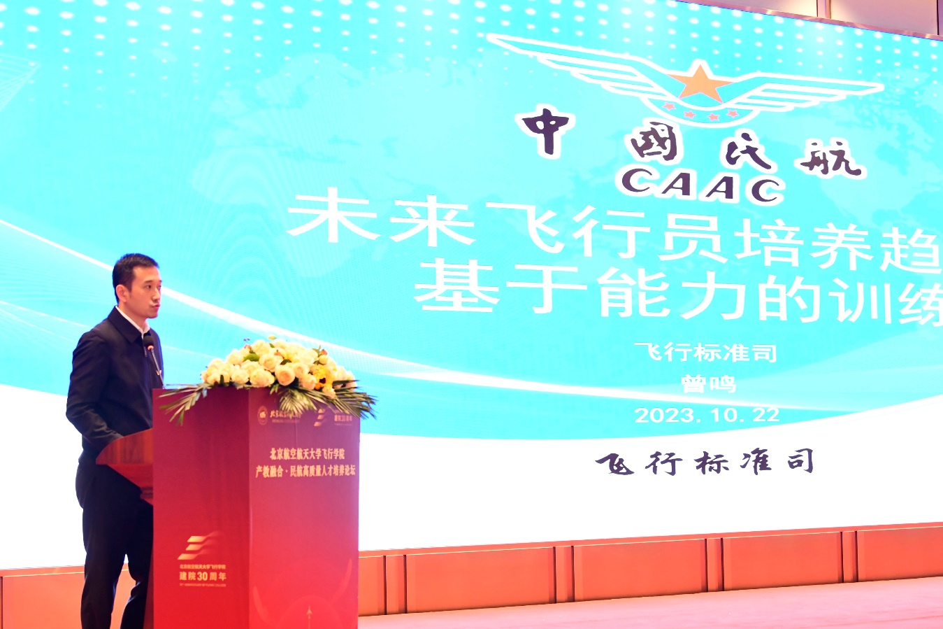 中国民航局飞行标准司运输飞行标准处处长曾鸣以《未来飞行员培养趋势:基于能力的训练》为题作报告。曾鸣介绍了基于胜任能力的培训和评估体系(CBTA),强调了培训理念、训练方式、管理模式三个方面的转变,讲解了中国民航运输航空飞行员技能全生命周期管理体系建设实施路线。