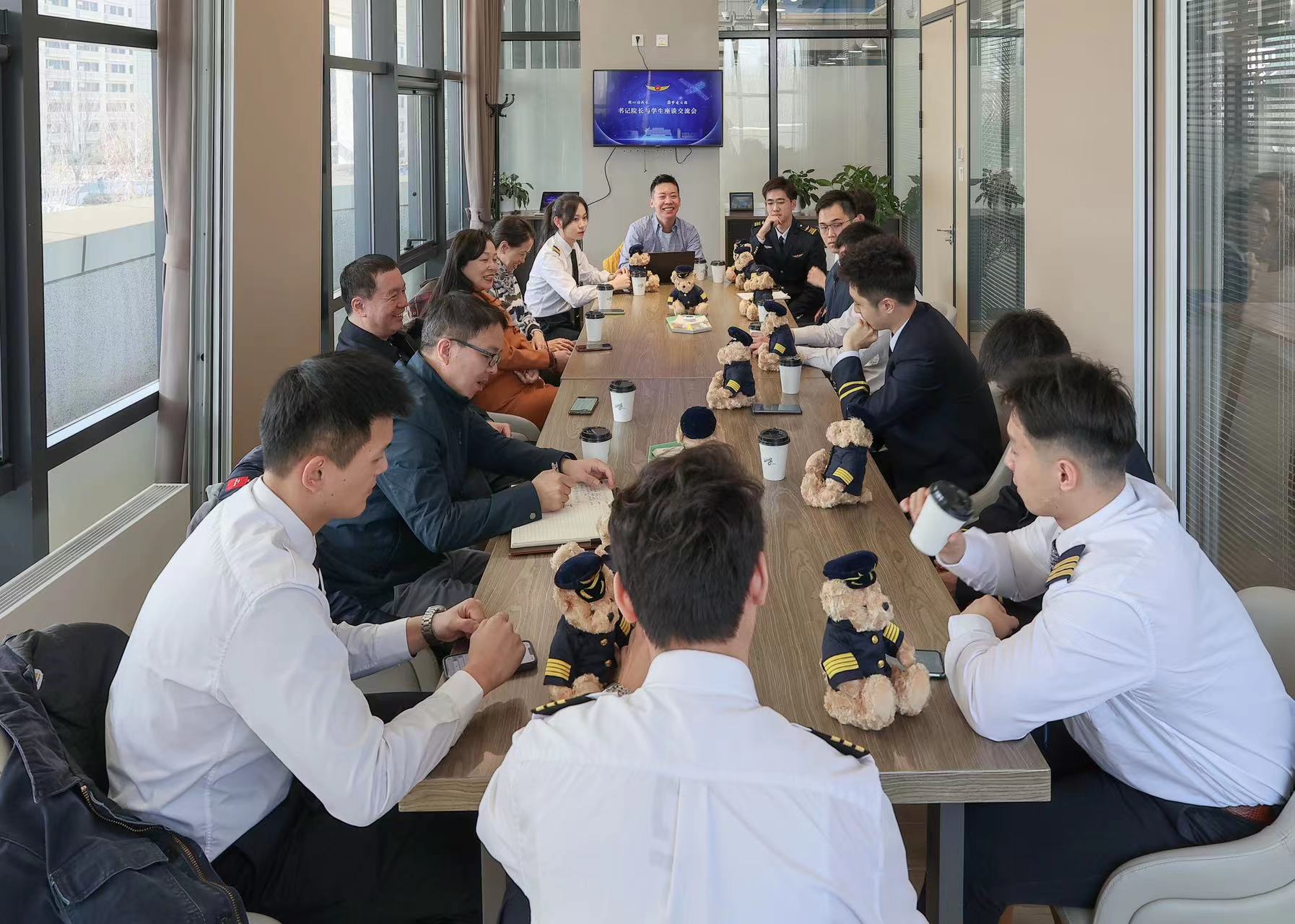 朱颖书记与王养柱经理与同学们亲切交流,全面了解同学们校园学习生活、航校飞行训练等各阶段情况,询问了解员工们的体验感受和问题困难,并围绕价值观念塑造、职业发展规划、身心素质培养等提出殷切期望,希望同学们能够更加珍惜大学时光,更好地武装自己,将来为民航事业做出更大贡献。