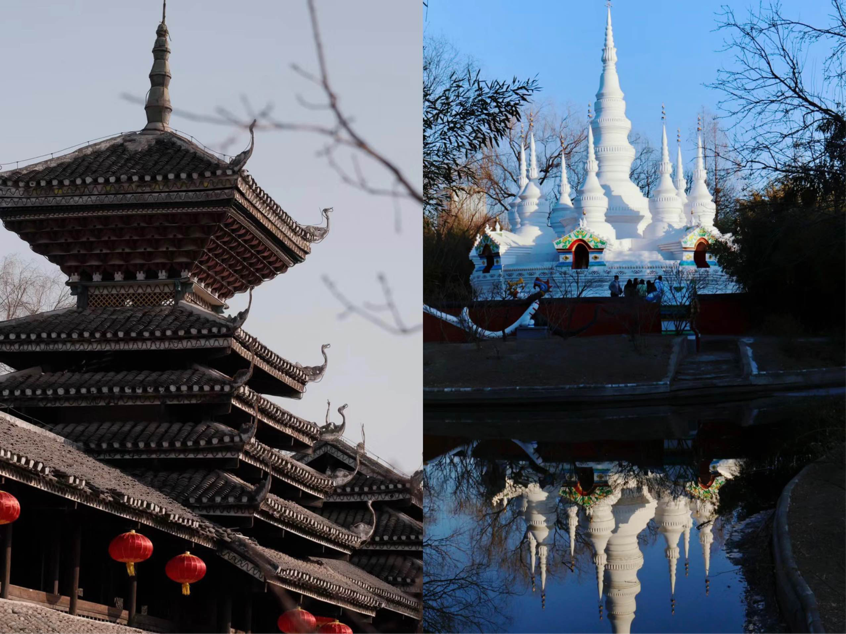 同学们在园内游逛时被各式各样的建筑所吸引,驻足时间最长的是在傣族园内。建筑按云南省西双版纳地区傣族典型建筑形式而复原,墙壁为木板或片竹,屋顶通常为歇山草顶或瓦片顶,下层亦常设有腰檐、陡屋面、斜墙板的独特民族形式和地方特色。同学们在参观后纷纷感叹我国各族人民适应当地环境时展现的智慧与少数民族歌舞艺术的魅力。