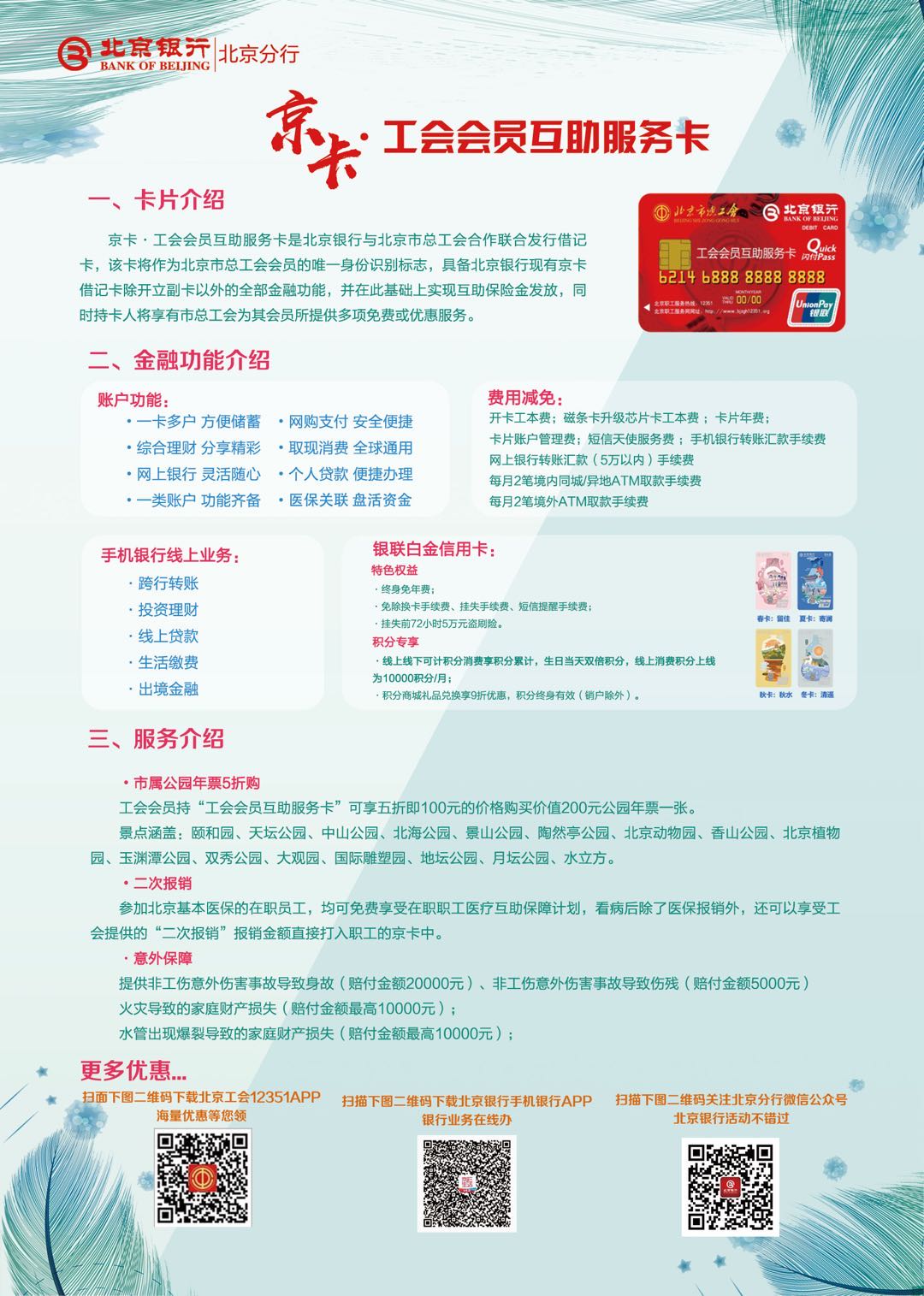 京卡∙工会会员互助服务卡是北京银行与北京市总工会合作联合发行的借记卡。该卡作为北京市总工会会员的唯一身份识别标志,具备北京银行现有京卡借记卡除开立副卡以外的全部金融功能,并在此基础上实现互助保险金发放,同时持卡人将享有市总工会为其会员所提供多项免费或优惠服务。如需办理,请联系所属基层工会。