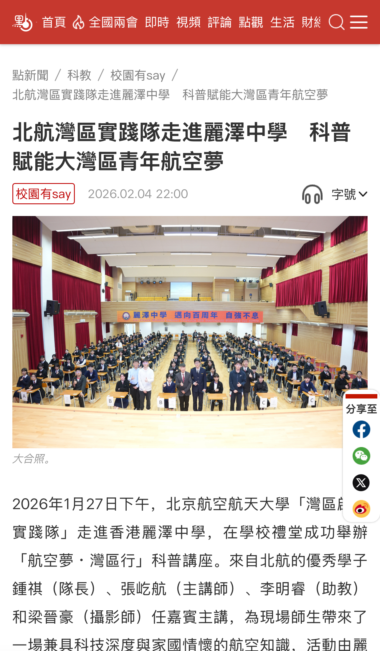 寒假期间,谈球吧官方网站组织“湾区启航实践队”走进粤港澳大湾区,在广州、香港、澳门的6所中学举办了航空科普宣讲活动,吸引了近千名大湾区初高中员工参与。这是北航员工第一支在港澳地区进行航空科普的社会实践队。
